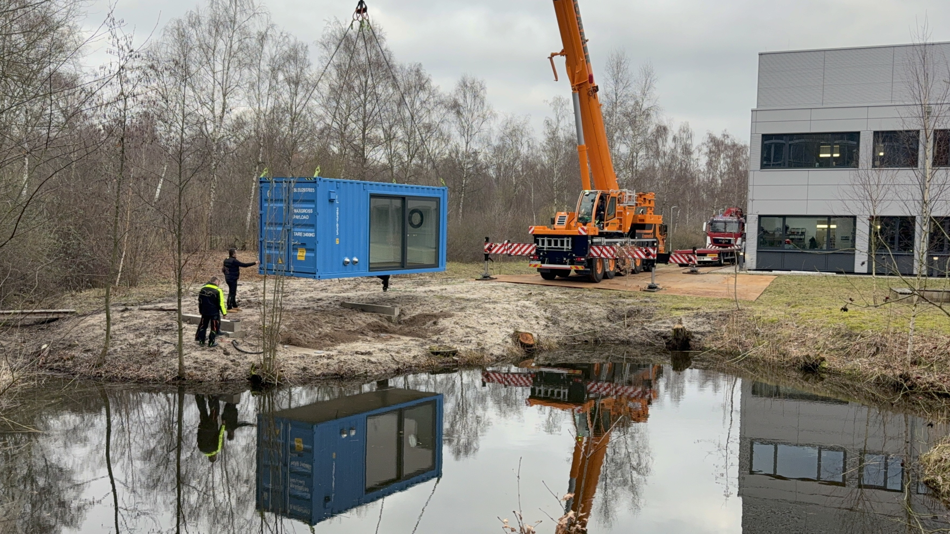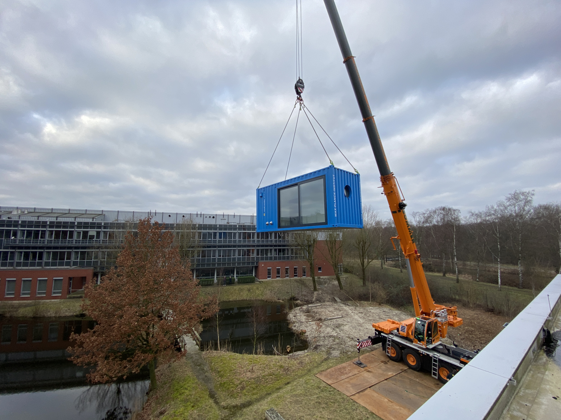 Das gilt nicht nur für viele unserer Forschenden, sondern neuerdings auch für einen ausgedienten Schiffscontainer, der zukünftig bei uns als Besprechungsraum dienen soll. Gestern ist der 20-Fuß-Container am Institutsteich installiert worden. Bei bestem Wetter konnten Lieferant, Kranführer, Elektriker und viele andere den Container auf sein zuvor gegossenes Fundament hieven.