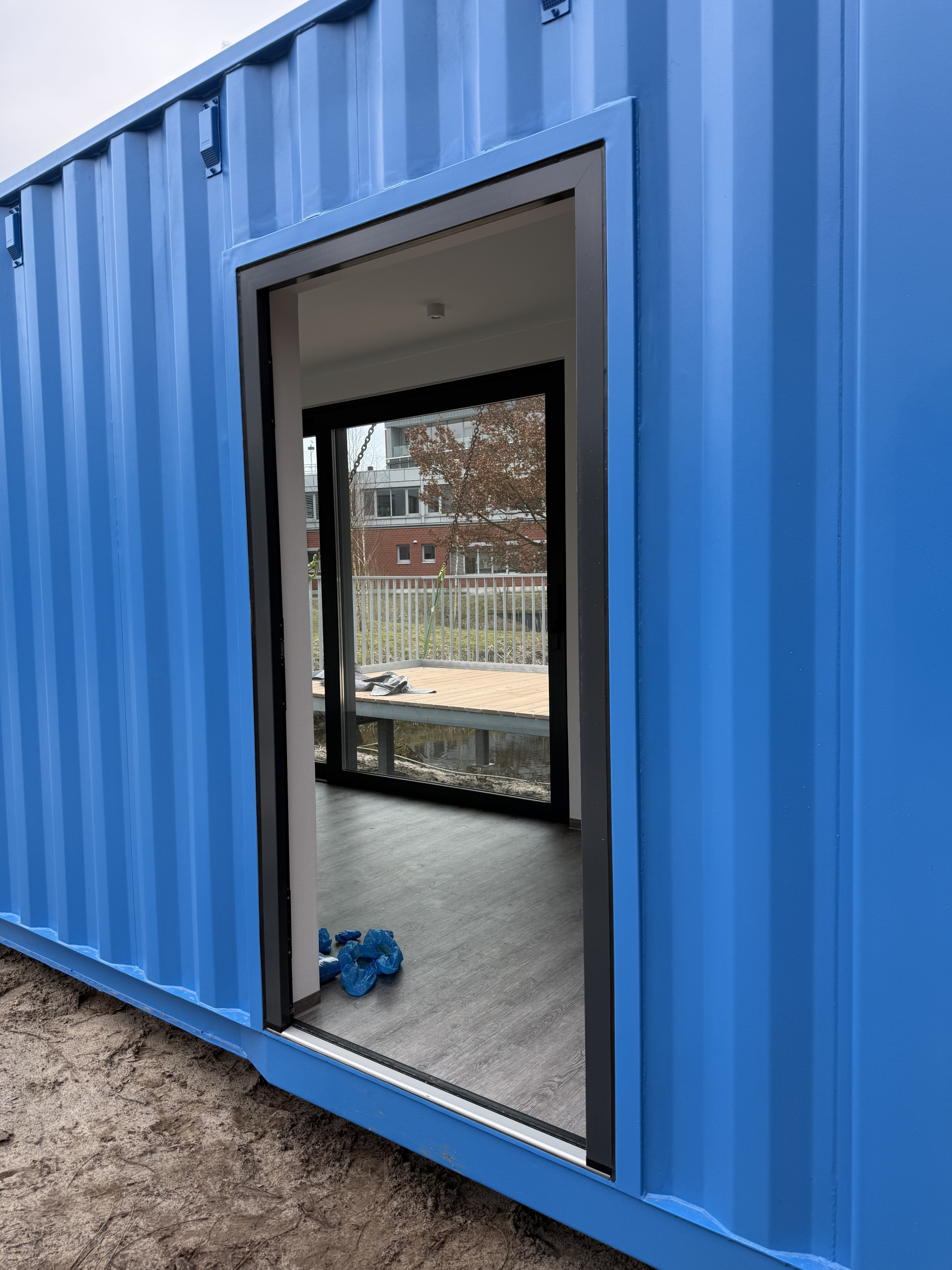 Der Container wurde schon im Vorfeld mit einer seitlichen Glasschiebewand, einem runden Bullaugenfenster, Tür und anderen erforderlichen Durchbrüchen versehen, gedämmt und gestrichen.