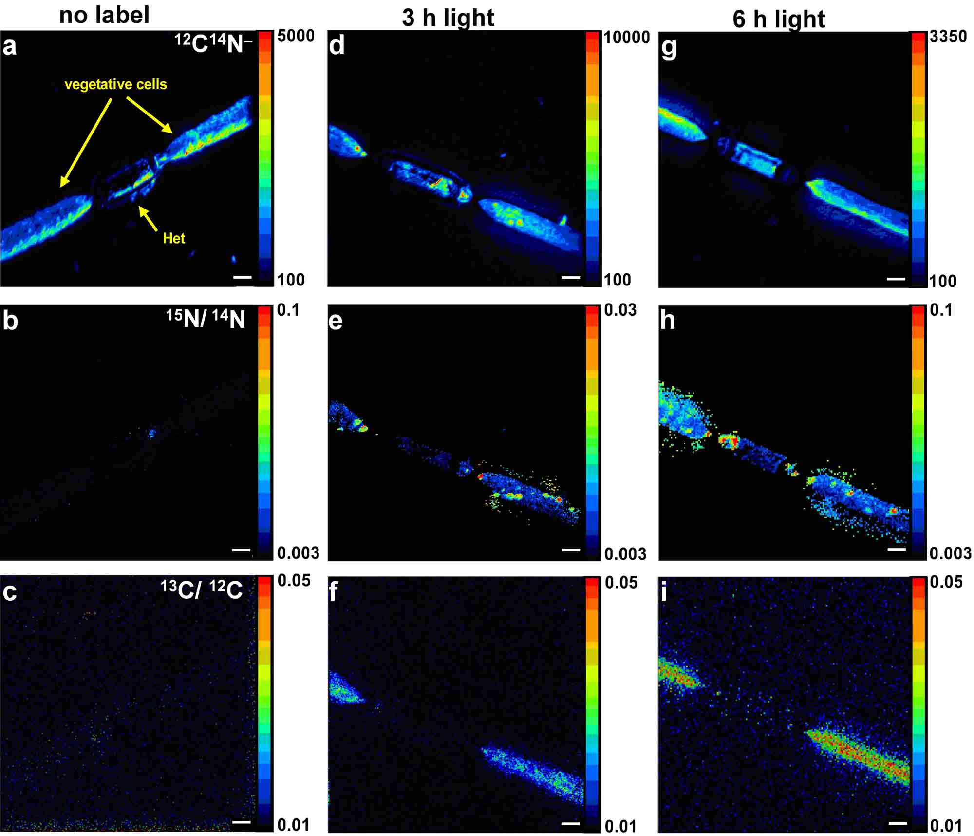 Figure 2 (Ploug, Musat et al., 2010): Distribution of 12C14N- (a,d,g), and 15N/14N (e,h), and 13C/12C (f,i) in single Aphanizomenon cells as measured by nanoSIMS. a-c: no label, d-f: t=3 h, g-i: t=6 h.