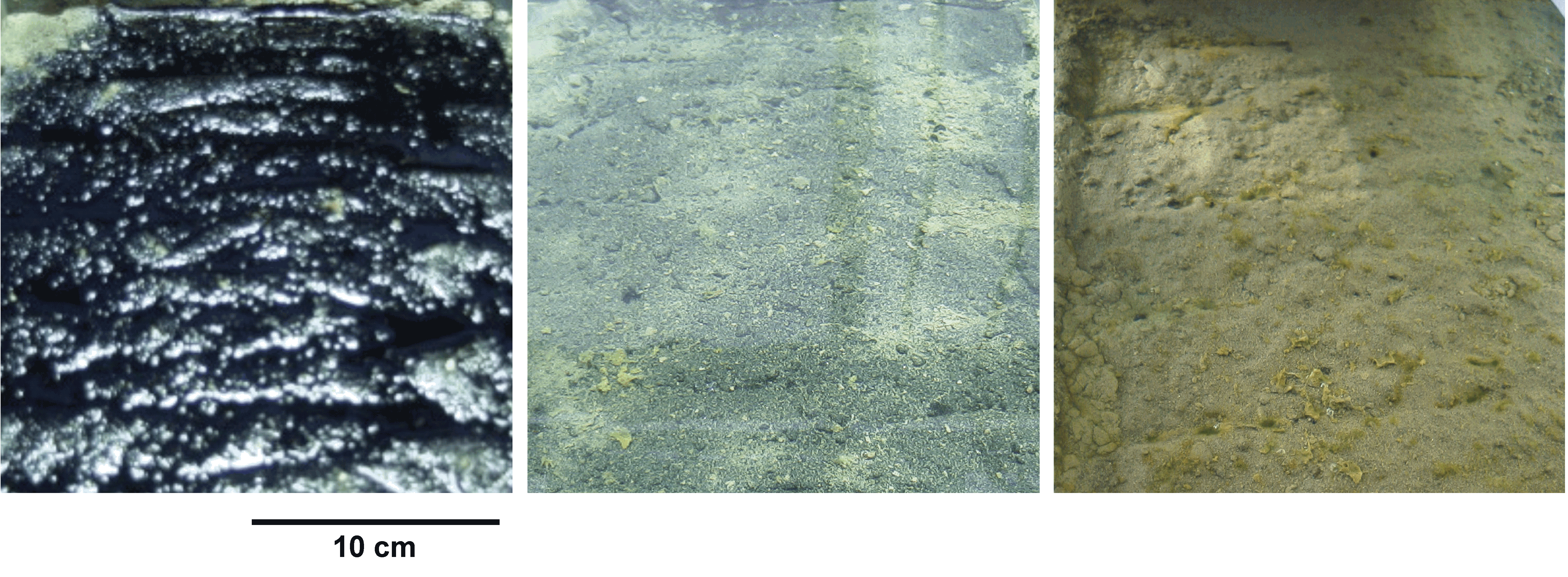 Abbildung 5: Abbauversuch im Laboraquarium mit Erdöl unter Zusatz von Stickstoff- und Phosphat-Dünger. Ein Stück Wattenmeer-Oberfläche wurde mit einer dünnen (1 Millimeter) Ölschicht bedeckt, die sich mit dem Schlamm verband, und geflutet Die Fotos am 1. Tag (links), nach 6 Tagen (Mitte) und 26 Tagen (rechts) zeigen die natürliche „Sanierung“ der Oberfläche. Doch darunter befindet sich weiterhin eine zähe Ölschicht, die nur sehr langsam weiter abgebaut wird. Foto: Florin Musat.