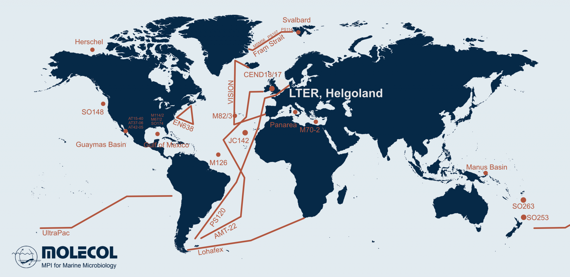 Mikroorganismen sind verantwortlich für etwa 70 % der Gesamtbiomasse im Meer und sie sind unabdingbar für das Ökosystem Meer. Sie regulieren die Vorkommen von organischer Materie, leiten globale Stoffkreisläufe und beeinflussen das Weltklima. Obwohl tausende Bakterien- und Archaeen-Arten isoliert und beschrieben wurden, finden wir Millionen mit molekularbiologischen Methoden in der Umwelt. Unsere Abteilung kombiniert modernste Techniken in einem fachübergreifenden Ansatz, um die Ökologie von mikrobiellen Gemeinschaften zu erforschen; und das von Hydrothermalquellen bis zum Oberflächenwasser und von den Tropen bis in Polarregionen.
