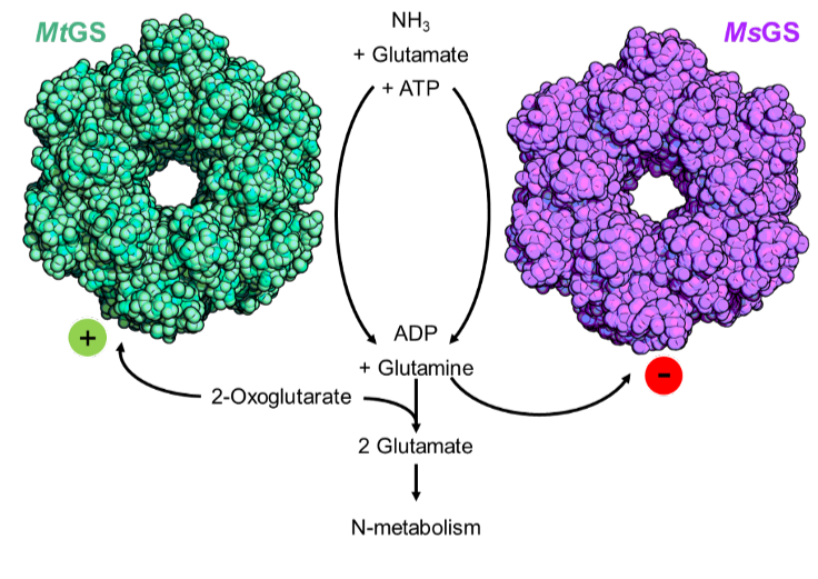 Als nächstes wollten die Forschenden herausfinden, wie genau das 2-Oxoglutarat den Schalter für die Stickstoffaufnahme in M. thermolithotrophicus einschaltet. Mittels Röntgenkristallographie unter Verwendung von Synchrotronstrahlung bestimmten sie die 3D-Struktur des zuvor kristallisierten Enzyms mit und ohne daran gebundenes 2-Oxoglutarat. Außerdem verglichen sie es mit dem anderen untersuchten Organismus, M. shengliensis. Bei M. thermolithotrophicus bindet das 2-Oxoglutarat in einer Tasche weit entfernt vom aktiven Zentrum des Enzyms, in dem die Reaktion stattfindet. Durch die Bindung an 2-Oxoglutarat kommt es zu Verschiebungen im Enzym, sodass es die aktive Form annimmt. Bei M. shengliensis hingegen kann das 2-Oxoglutarat nicht an das Enzym binden, deswegen ruft das 2-Oxoglutarat hier keine Reaktion hervor. „Jetzt können wir ganz genau beschreiben, wie der 2-Oxoglutarat-Schalter funktioniert und welche Enzyme dafür empfänglich sind“, so Müller.