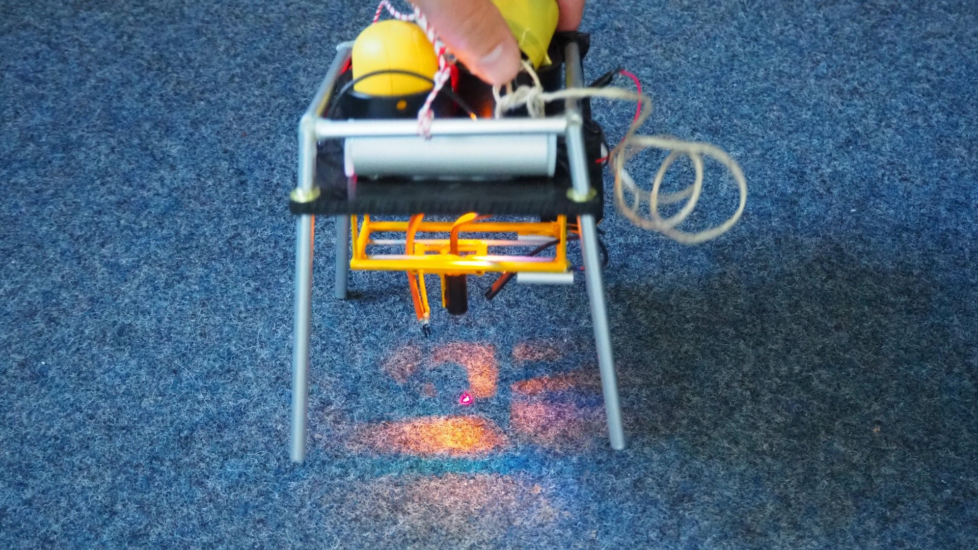 Die gelben Überraschungseier im Modell stehen für die Auftriebsbojen, welche durch ein akustisches Signal aktiviert werden. So kann Lance-A-Lot nach vollendeter Arbeit wieder auftauchen. Die große silberfarbene Röhre ist ein Computer, mit welchem sämtliche Messdaten erfasst werden. Auch zu erkennen ist zwischen den Überraschungseiern ein rötlicher Kasten, der für zwei aneinandergeschaltete LKW-Batterien steht.
