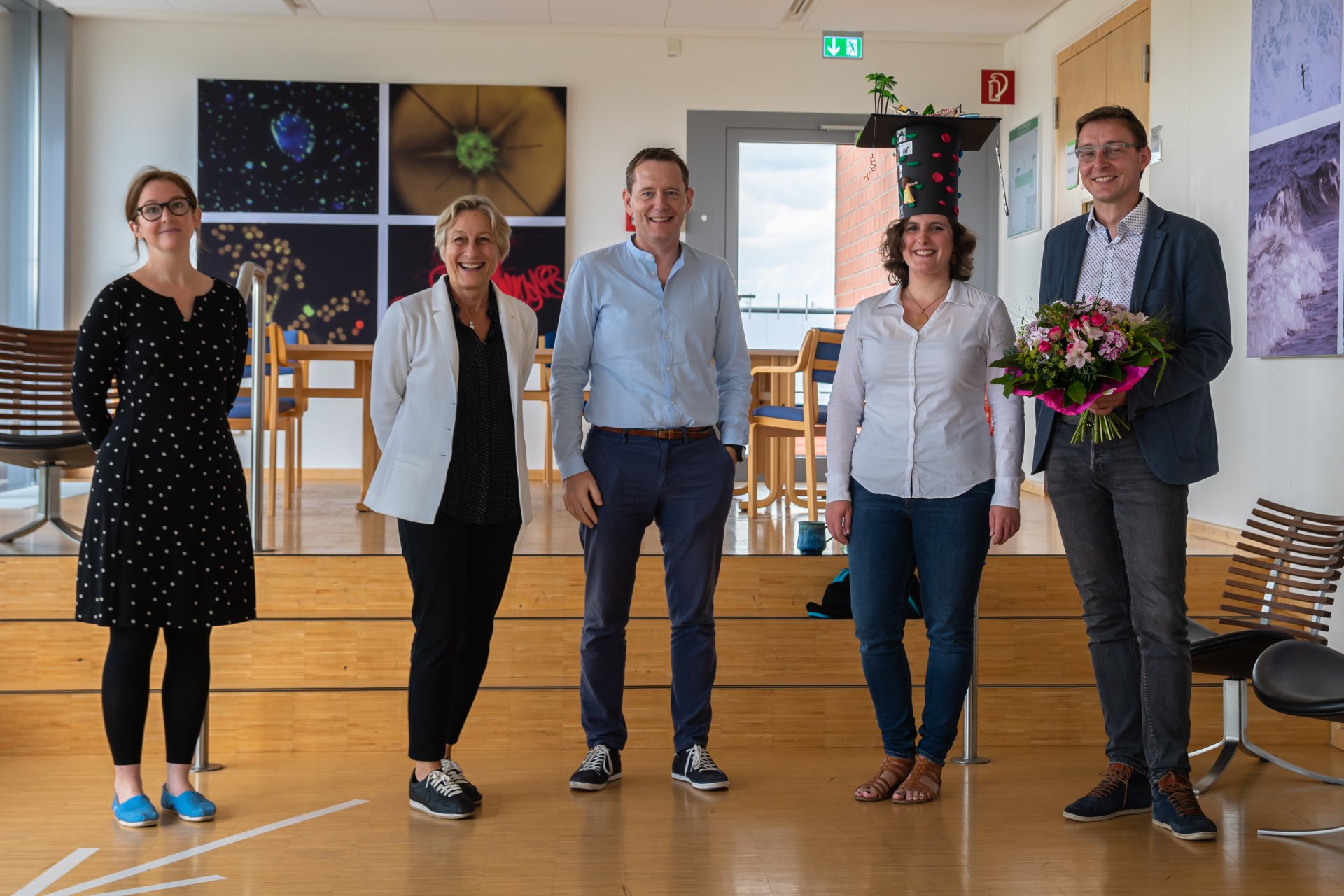 Congratulations: Dolma got her hat! (from left to right: Dr. Elizabeth Hambleton, Prof. Dr. Nicole Dubilier, Prof. Dr. Marcel Kuypers, Dolma Michellod, Dr. Manuel Liebeke) © Max Franke