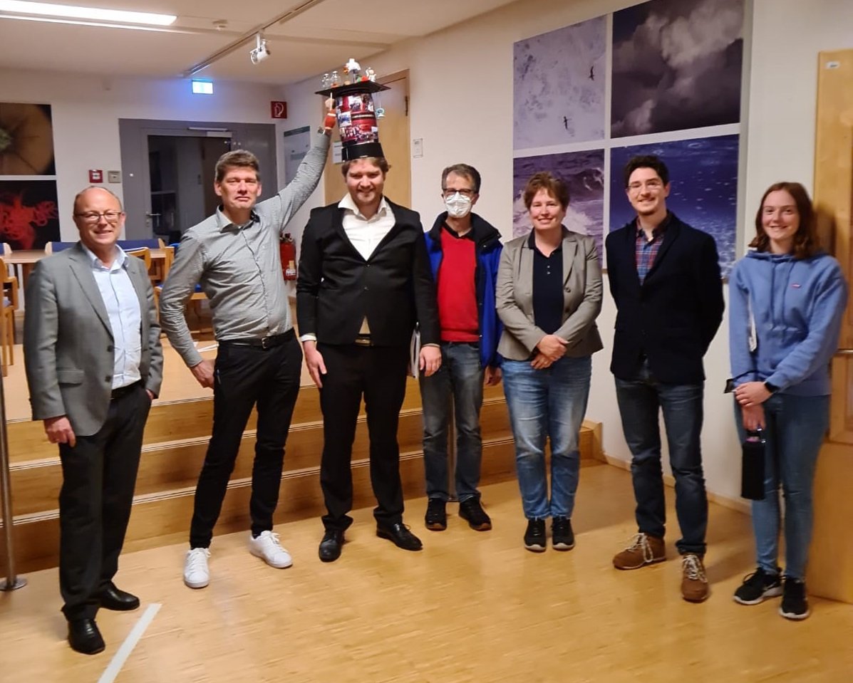 Congratulations! Max got his hat. (from left to right: Prof. Dr. Nicole Dubilier, Prof. Dr. Marcel Kuypers, Prof. Dr. Tilmann Harder, Maximilian Franke, Carlotta Kück, Dr. Nikolaus Leisch) © B. Geier/MPIMM