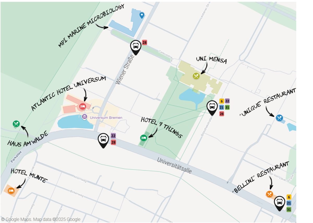 Tram line 6 departs from both Bremen Airport and Bremen Central Station in the direction of ‘Universität’ and will take you to the venue ('Universität-Süd' tram stop). You can reach the ATLANTIC in about 5 minutes on foot along Universitätsallee. Alternatively, you can reach us via tram line 8 from central station to the terminus 'Kulenkampffallee' and change to bus line 22 (Horn-Lehe/Spittaler Straße) to the 'Wiener Straße' bus stop, which is almost directly in front of the ATLANTIC.