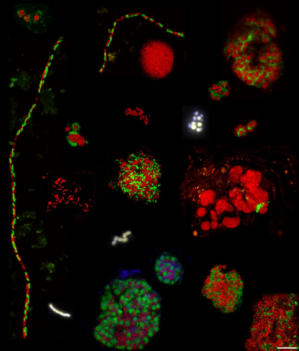 Micrographs of aerobic methanotrophic bacteria (white), anaerobic methanotrophic archaea (ANME – red) and sulfate-reducing bacteria (SRB – green) visualized by fluorescence in situ hybridization. ANME and SRB perform the anaerobic oxidation of methane (AOM). AOM is a globally relevant process removing 60 million tons, the mass of ten pyramids of Giza, of the greenhouse gas methane from seafloor sediments each year. Courtesy of Katrin Knittel/Emil Ruff, MPI Bremen.